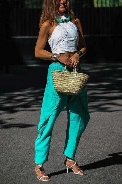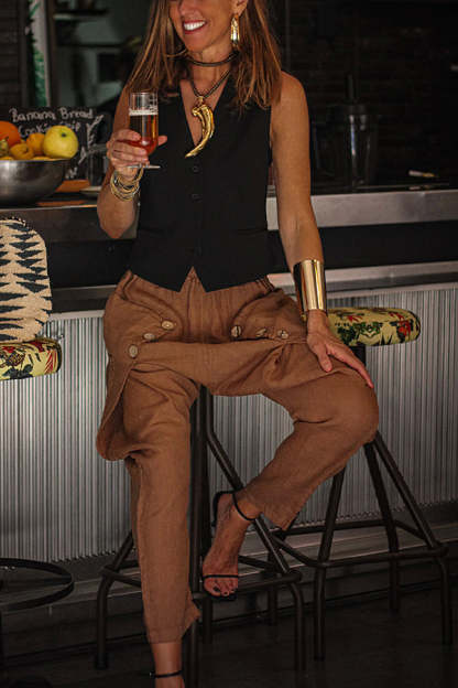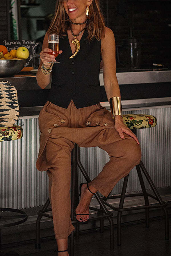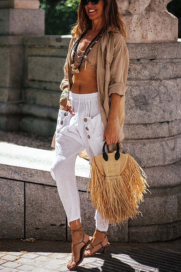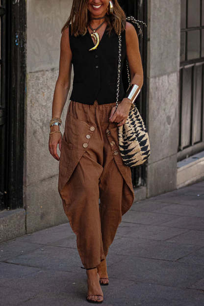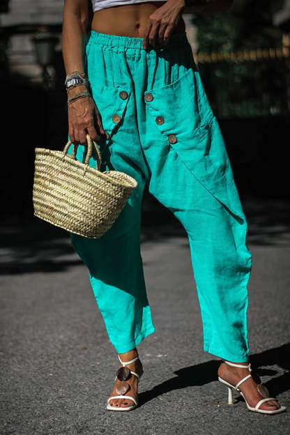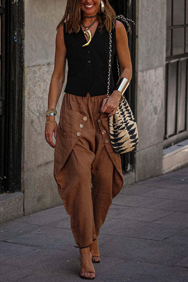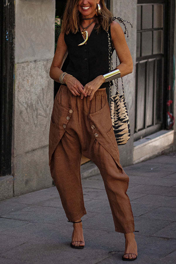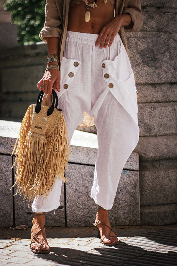 Brenna Linen Blend Pocketed Button Detail Elastic Waist Hippie Pants