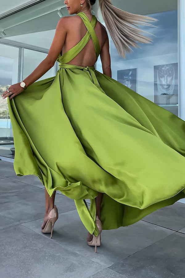 Different Elegant Effects Satin Free Tie Neck Slit Maxi Dress