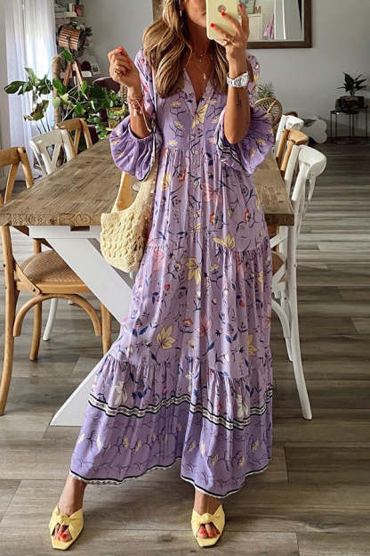 Lavender Flavor Printed Long Sleeve Button A-line Maxi Dress