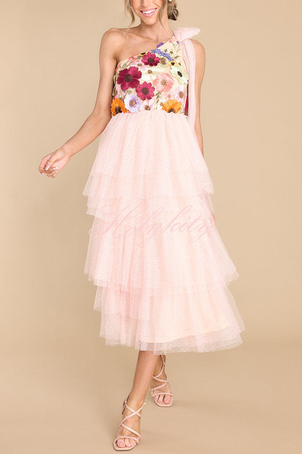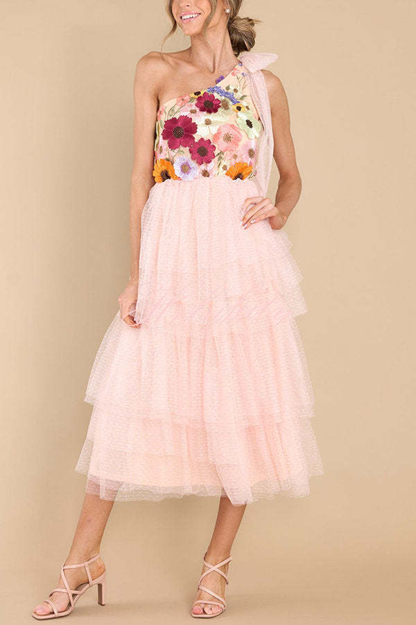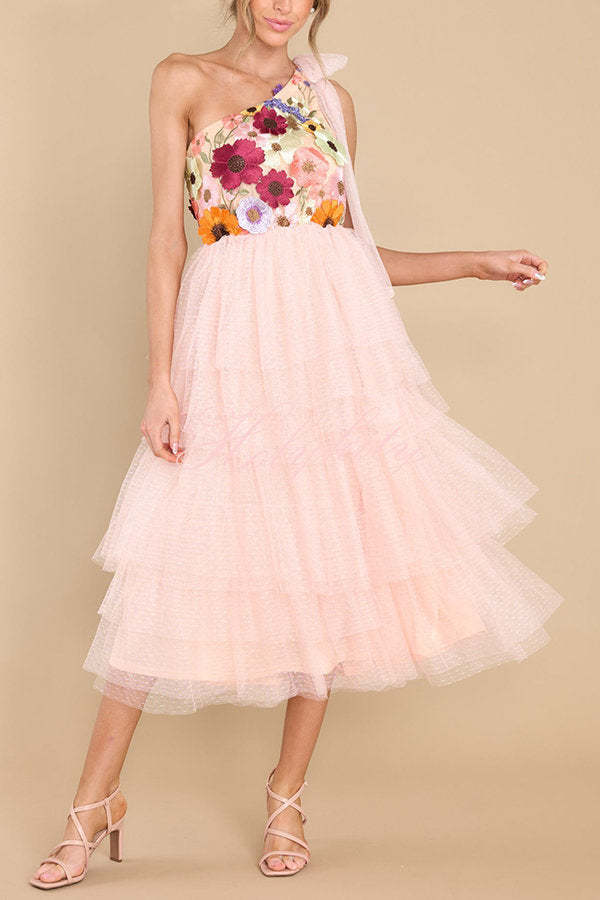 Midnight Garden Embroidered Floral Applique One Shoulder Tiered Tulle Midi Dress