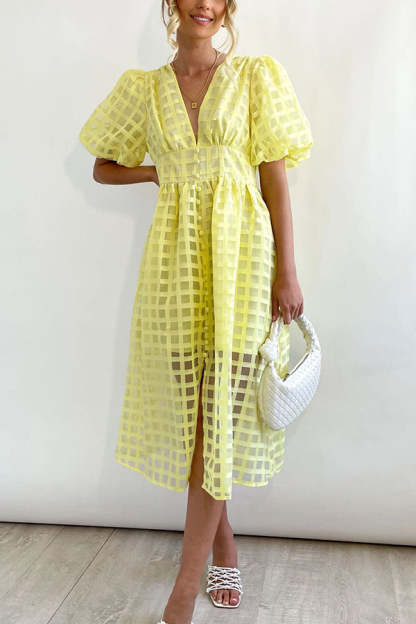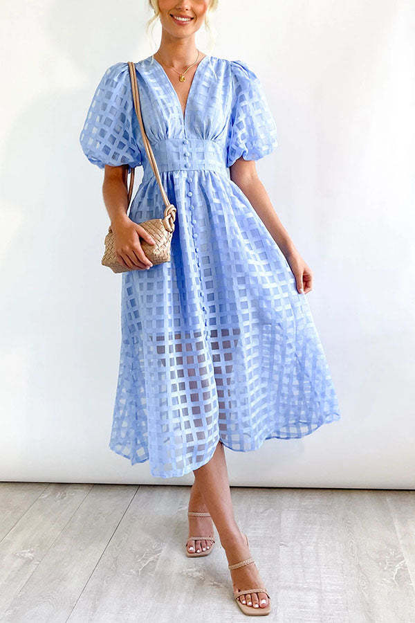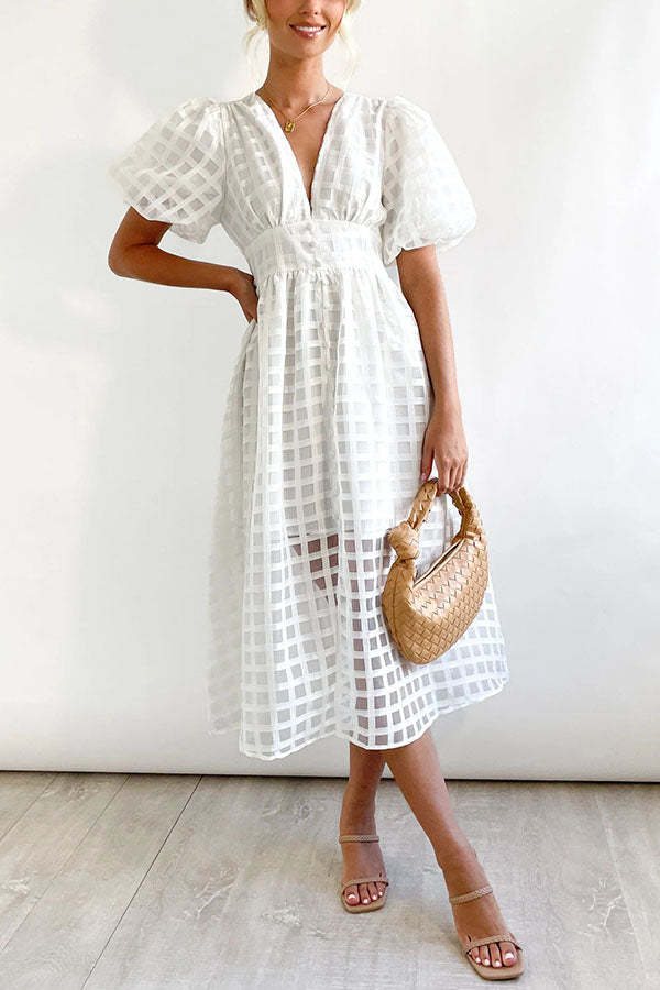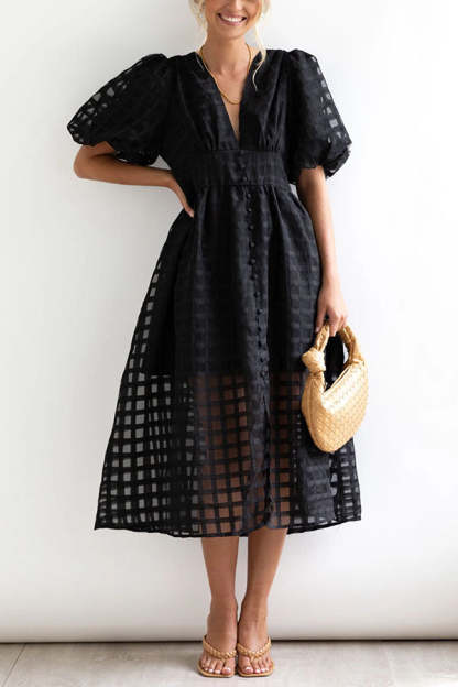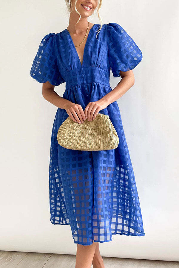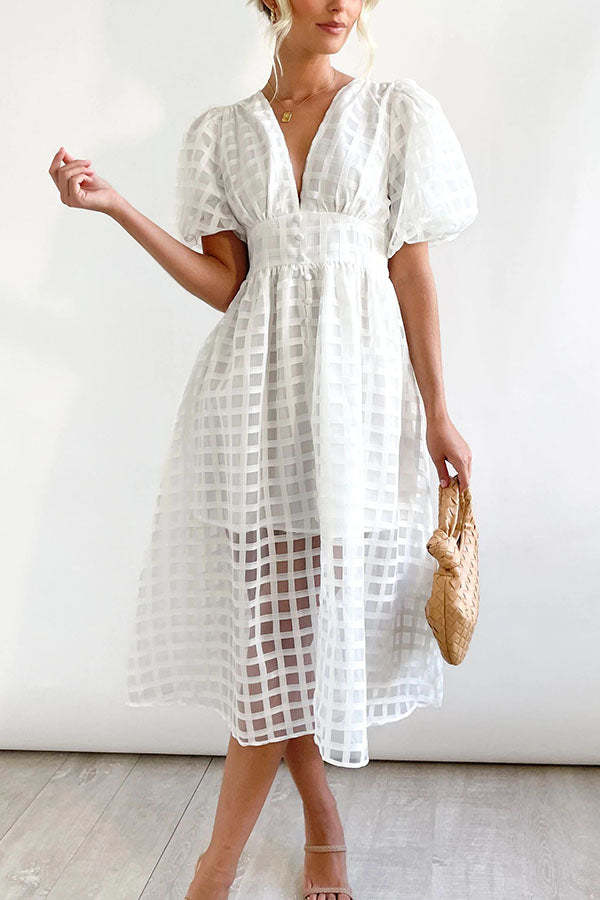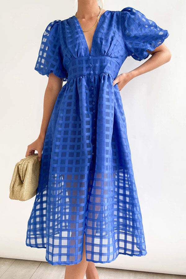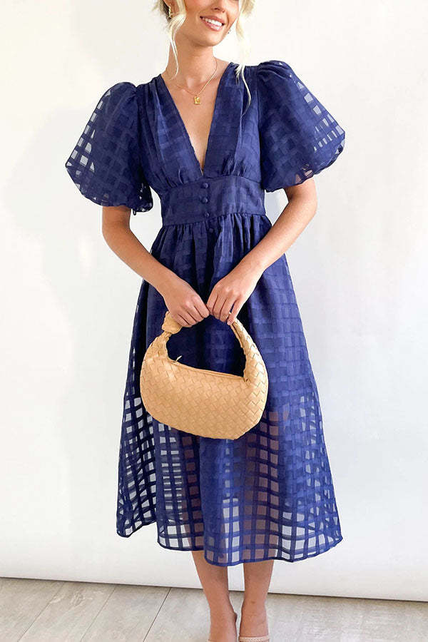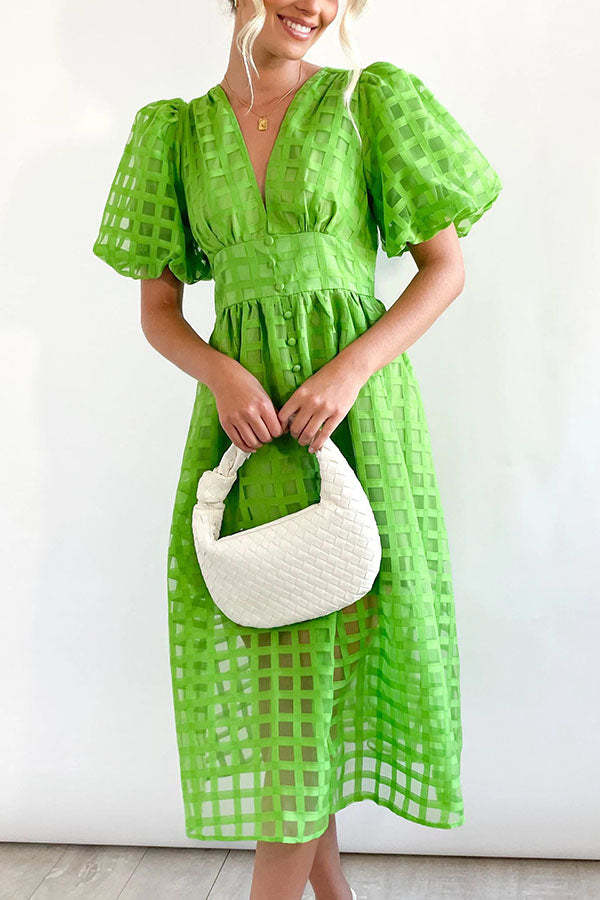Remarkable Beauty Square Patterned Fabric Puff Sleeve Midi Dress