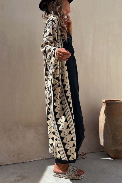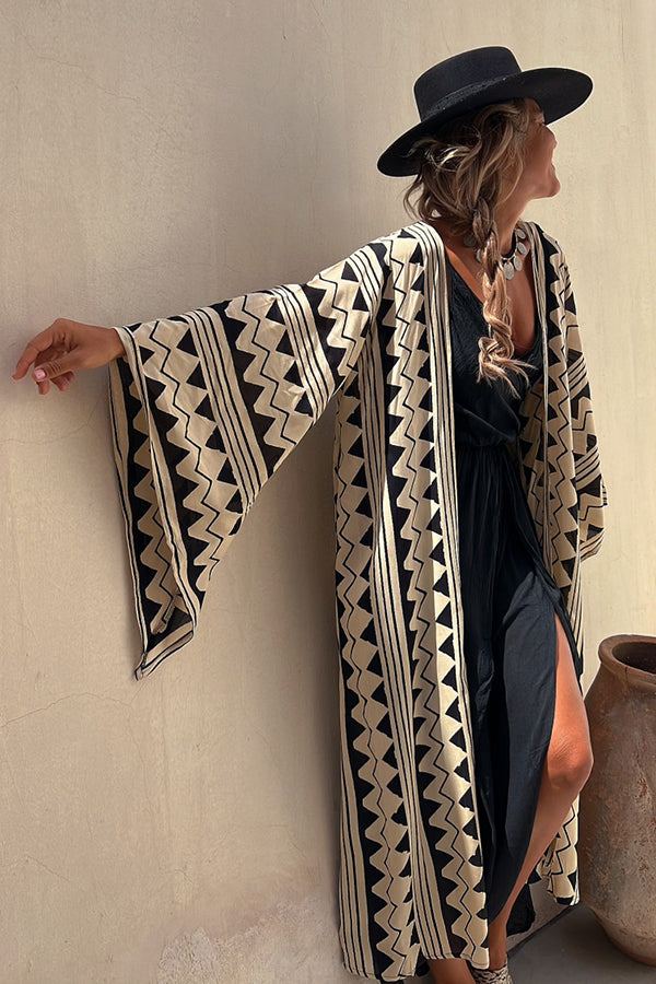Retro Ethnic Print Open Front Bell Sleeve Duster Kimono
