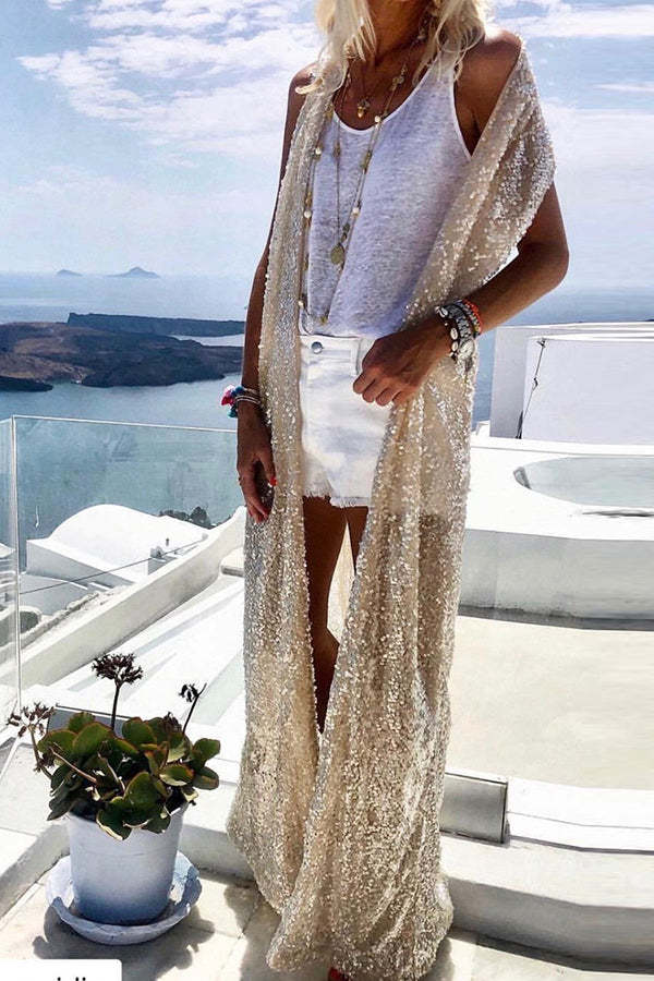 Shine Bright Sequins Open Front Maxi Kimono Coat
