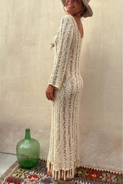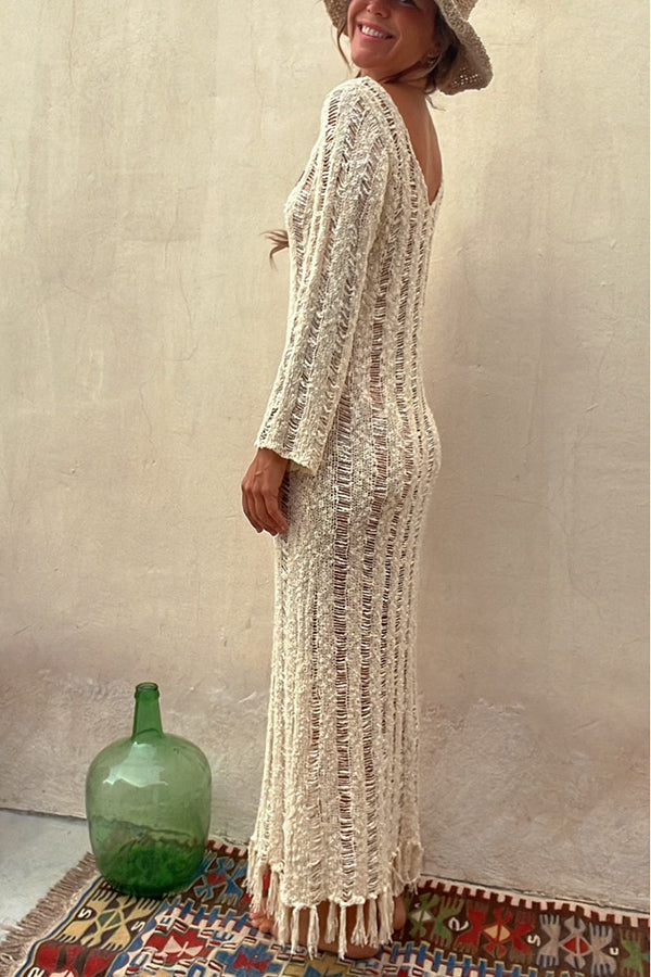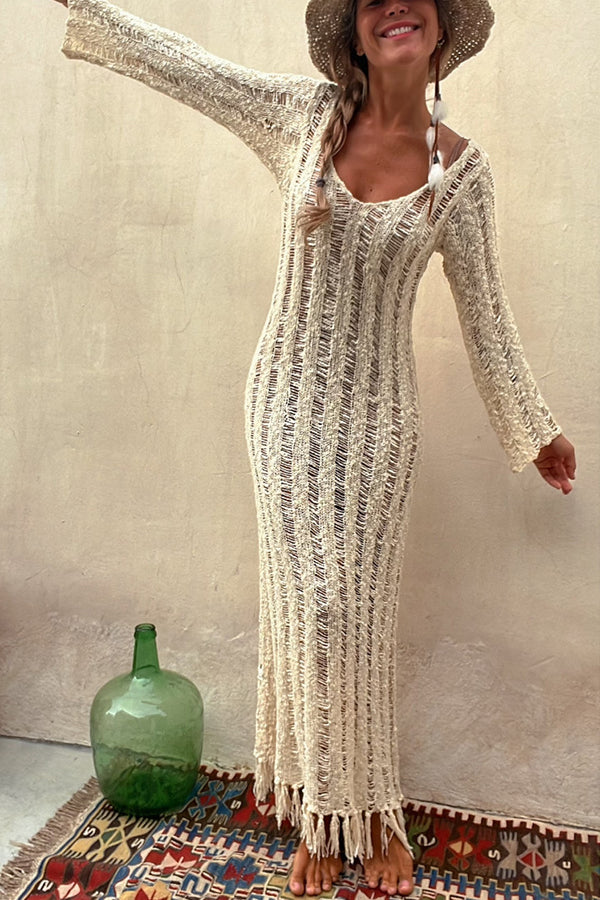 Somewhere Sunny Hollow Out Tassel Long Sleeve Knit Beach Maxi Dress