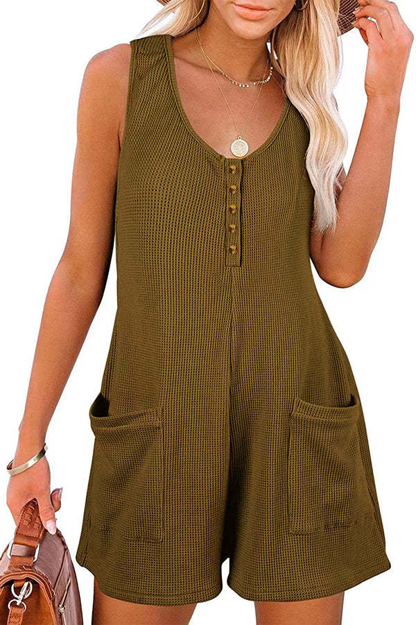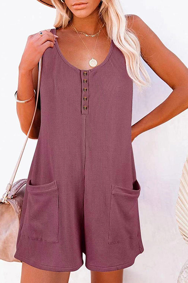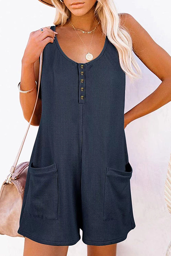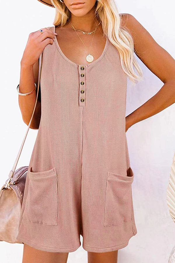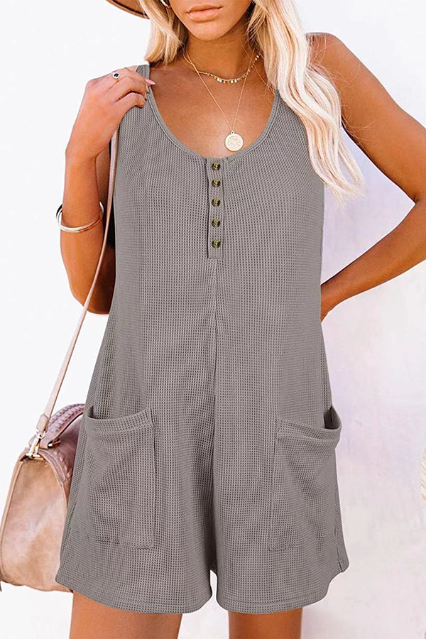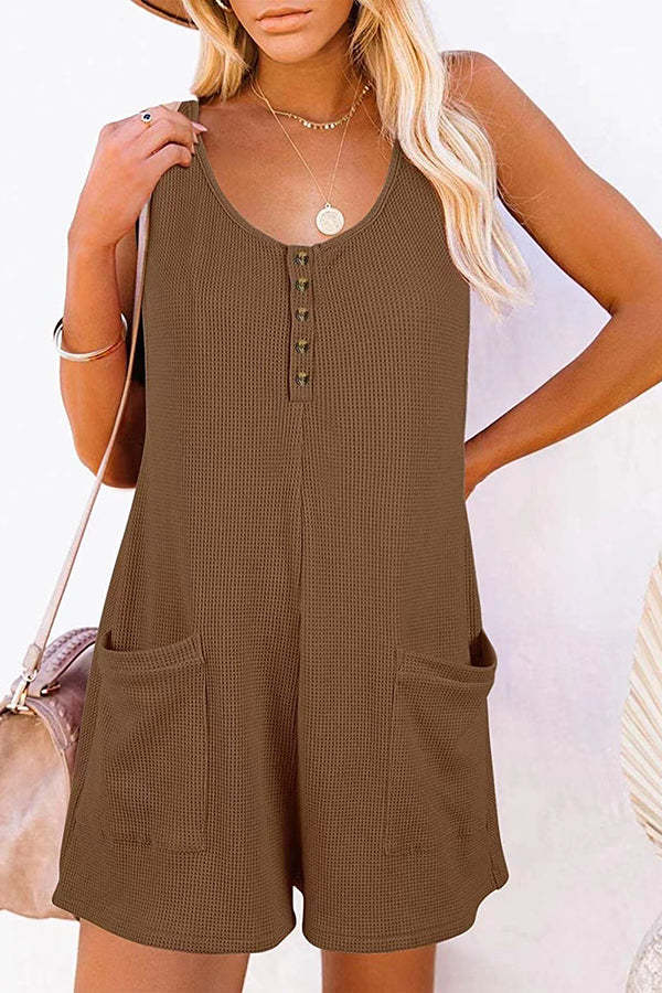 Summer Camping Waffle Fabric Button Up Pocketed Loose Romper