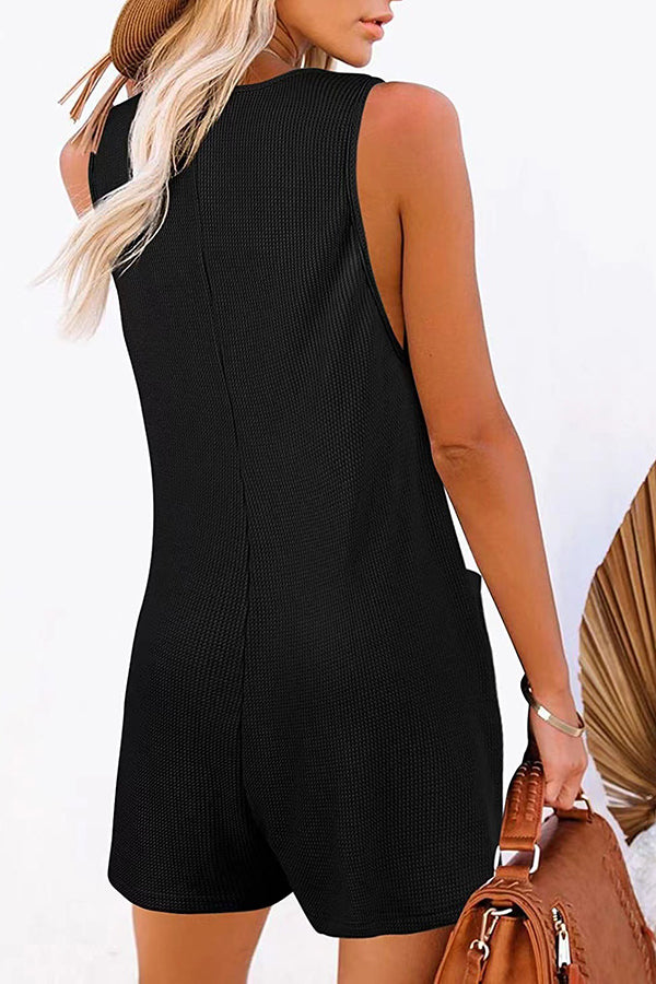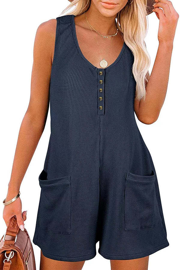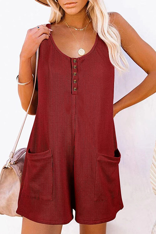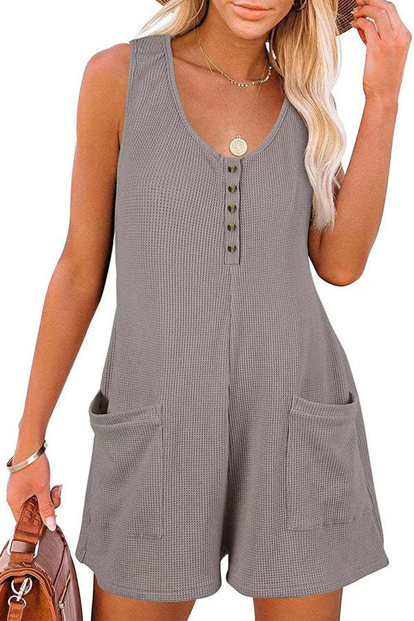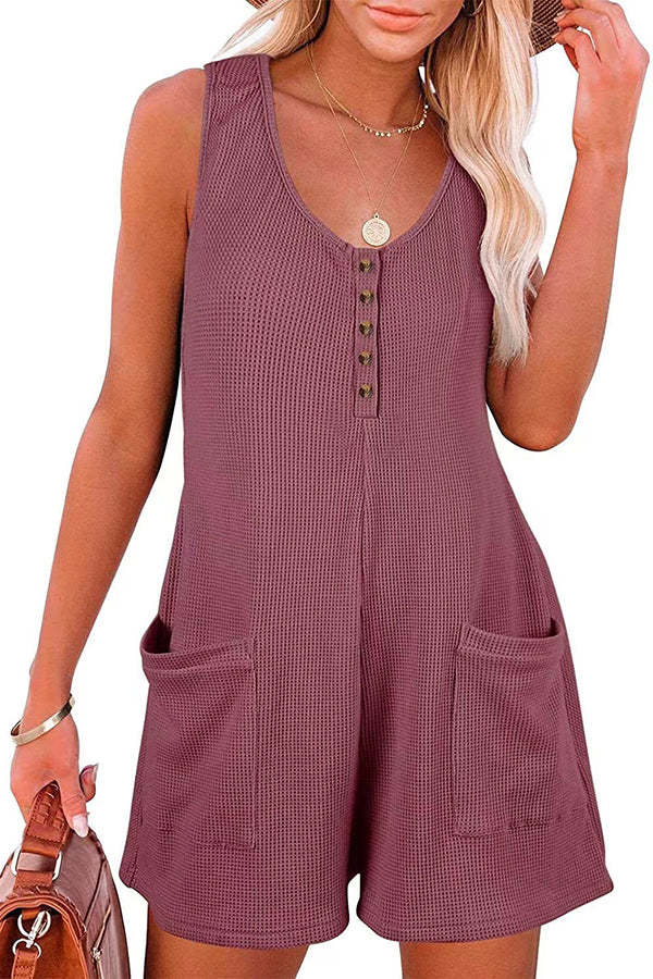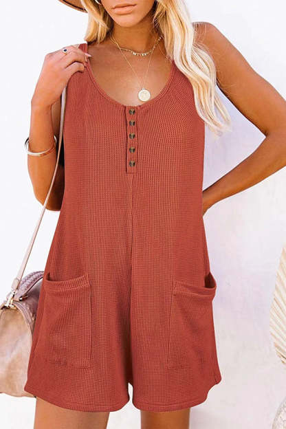 Summer Camping Waffle Fabric Button Up Pocketed Loose Romper