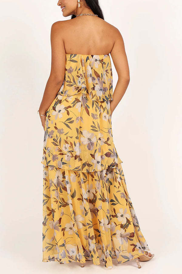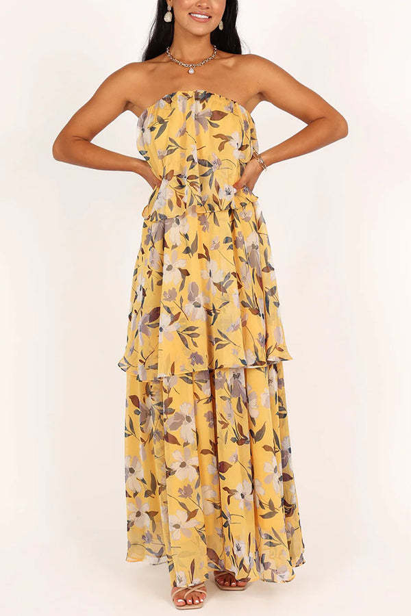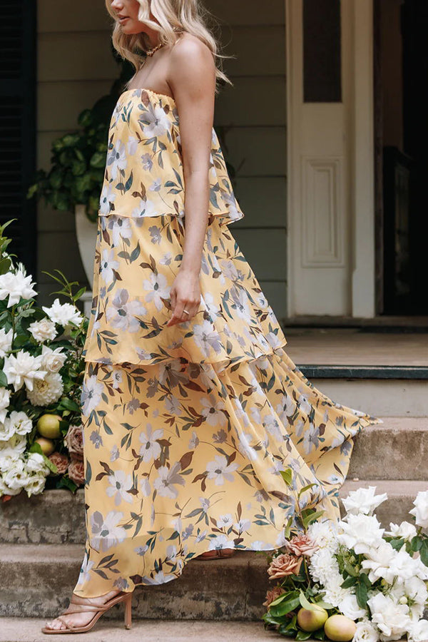 Sweet and Charming Printed Strapless Drop Tiered Ruffle Maxi Dress
